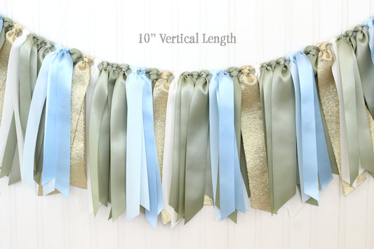 6-8 ft Sage Green, Light Blue, Off White and Gold Ribbon Garland | Boy Baby Shower | Woodland First Birthday Decoration