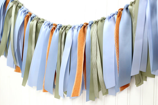 6-8 ft Sage, French Blue, Harvest Orange Ribbon Garland | Baby Safari | Woodland Baby Shower Decoration