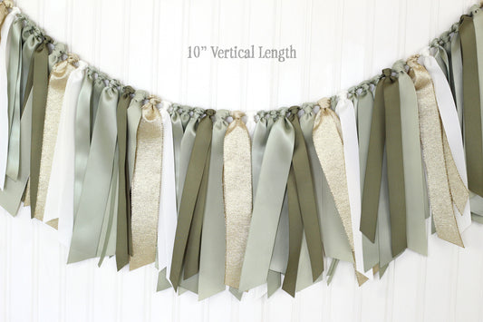 6-8 ft Sage, Olive Green, Off White and Gold Ribbon Garland | Gender Neutral Baby Shower | Woodland First Birthday Decoration